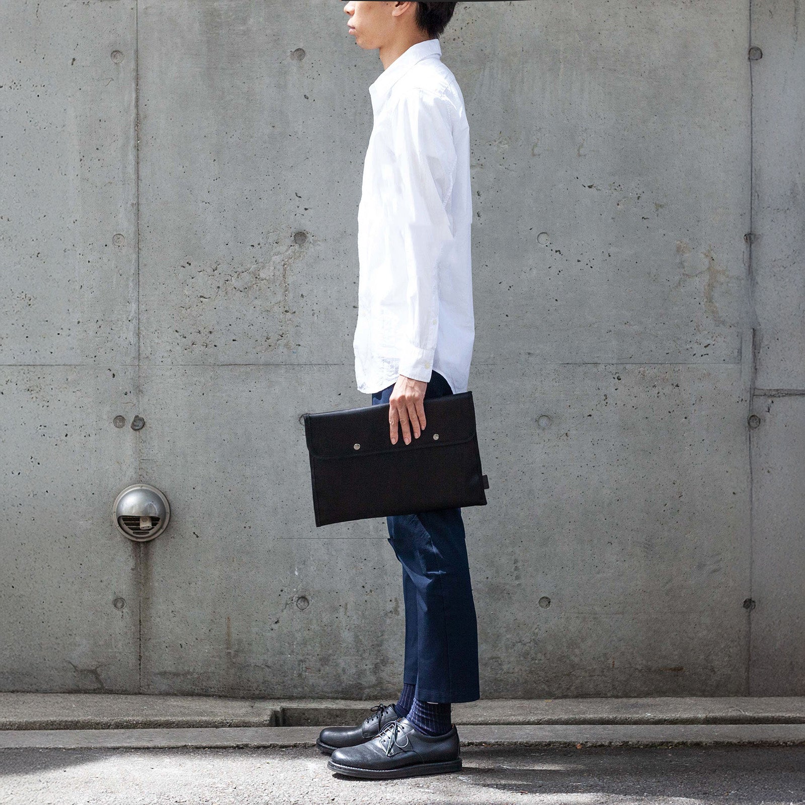 無駄を削ぎ落としたオールブラックのミニマルデザインは、ビジネスにもカジュアルにも馴染み、クラッチバッグのように単体で持ち歩いてもサマになる佇まい。