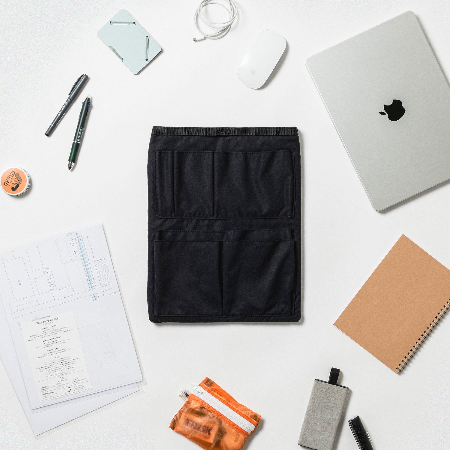 メインポケットは最大16インチのMACBOOKが収納可能。壁内側にEVAクッション材を配置しているためPCを保護しつつ、自立性も高くなっている。前面は小分けしたポケットが多数配置されており、細かな分別が可能。上部には目立たない形でハンドルがついており、単体利用でも十分に便利なオーガナイザーとなっている。