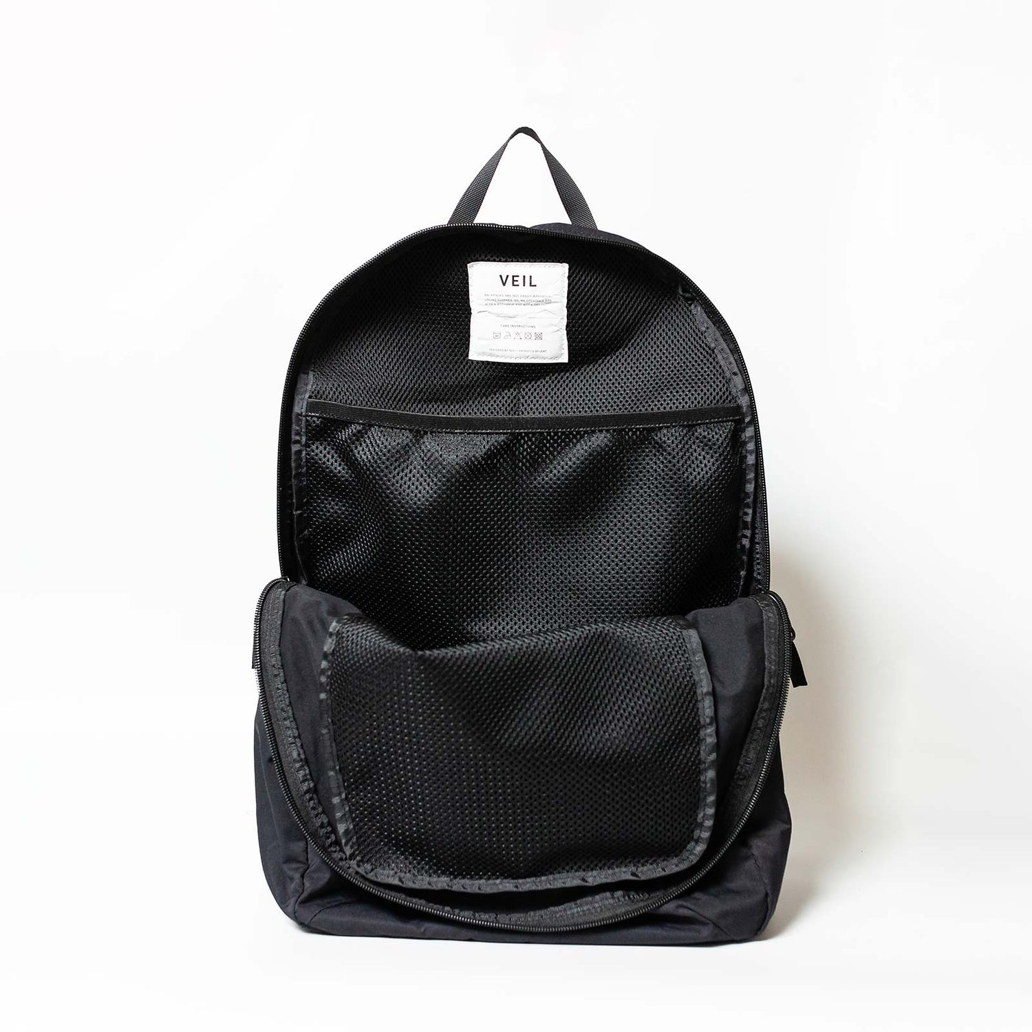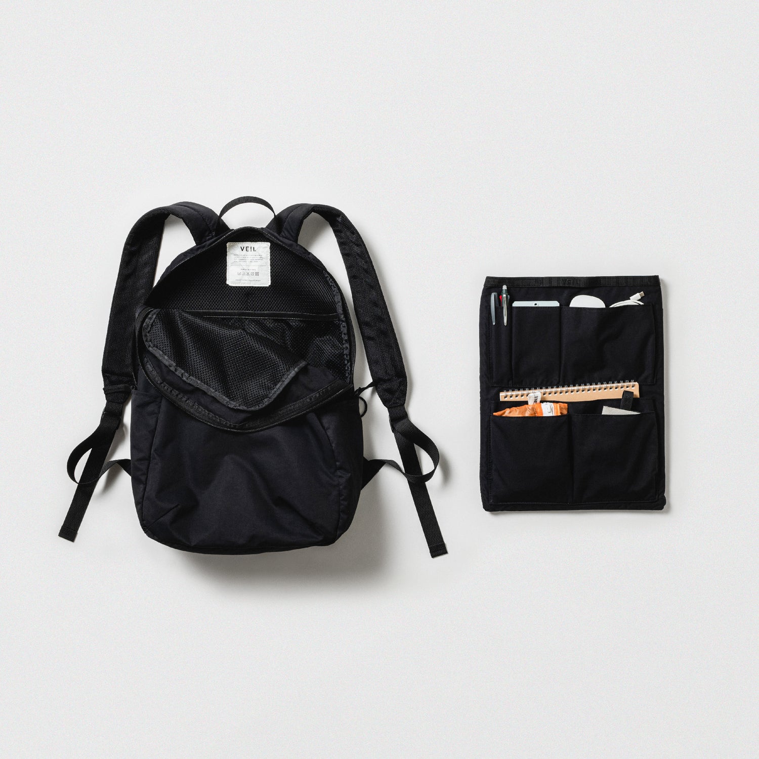 【アウター単体】「洗えるバッグ」として開発された、小物類を集約するインナーバッグと、それを収納するアウターがワンセットとなっているVEIL。20リットルほどの収納量は、一般的なデイパックよりもやや多めに入るサイズとなっている。