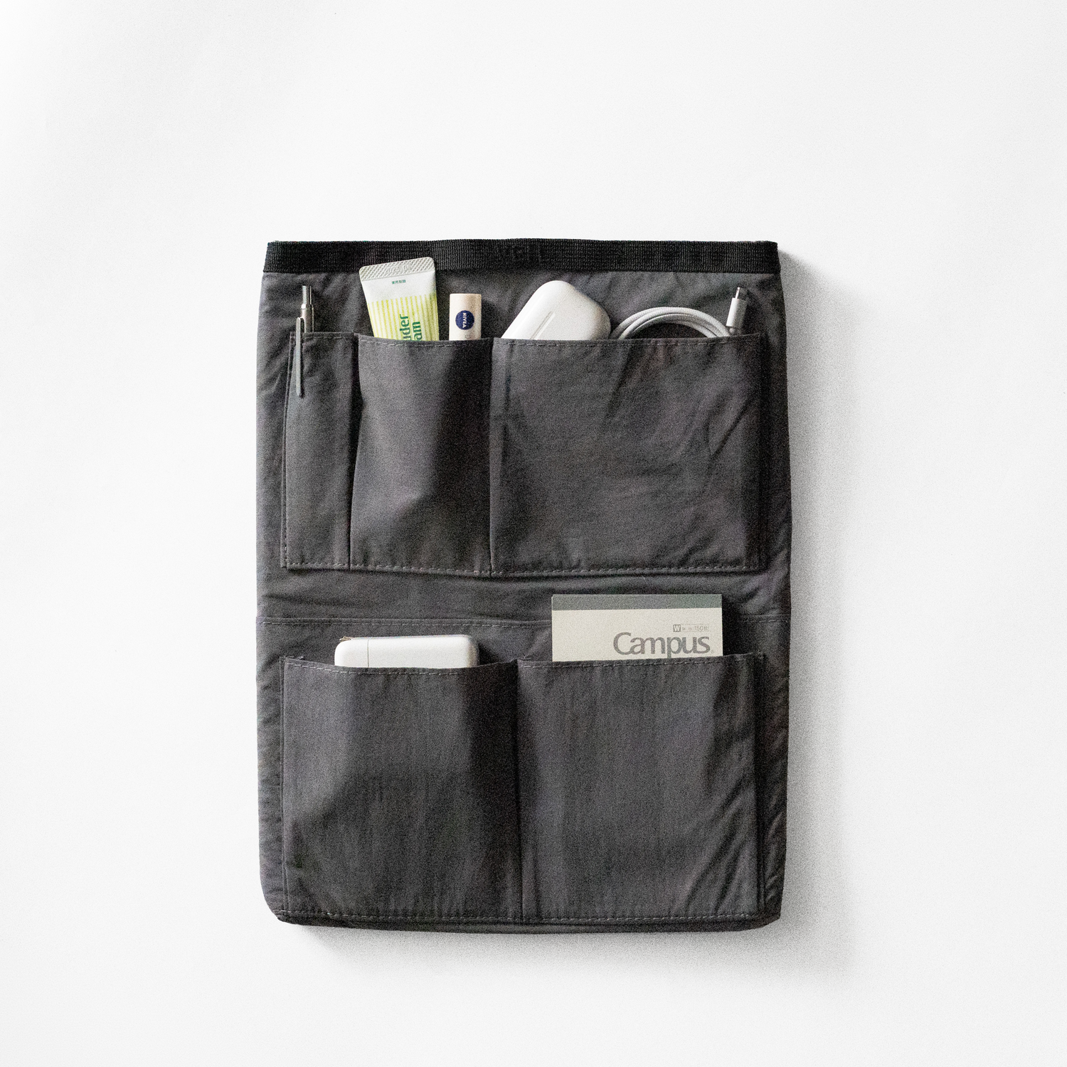 メインポケットは最大16インチのMACBOOKが収納可能。壁内側にEVAクッション材を配置しているためPCを保護しつつ、自立性も高くなっている。前面は小分けしたポケットが多数配置されており、細かな分別が可能。上部には目立たない形でハンドルがついており、単体利用でも十分に便利なオーガナイザーとなっている。