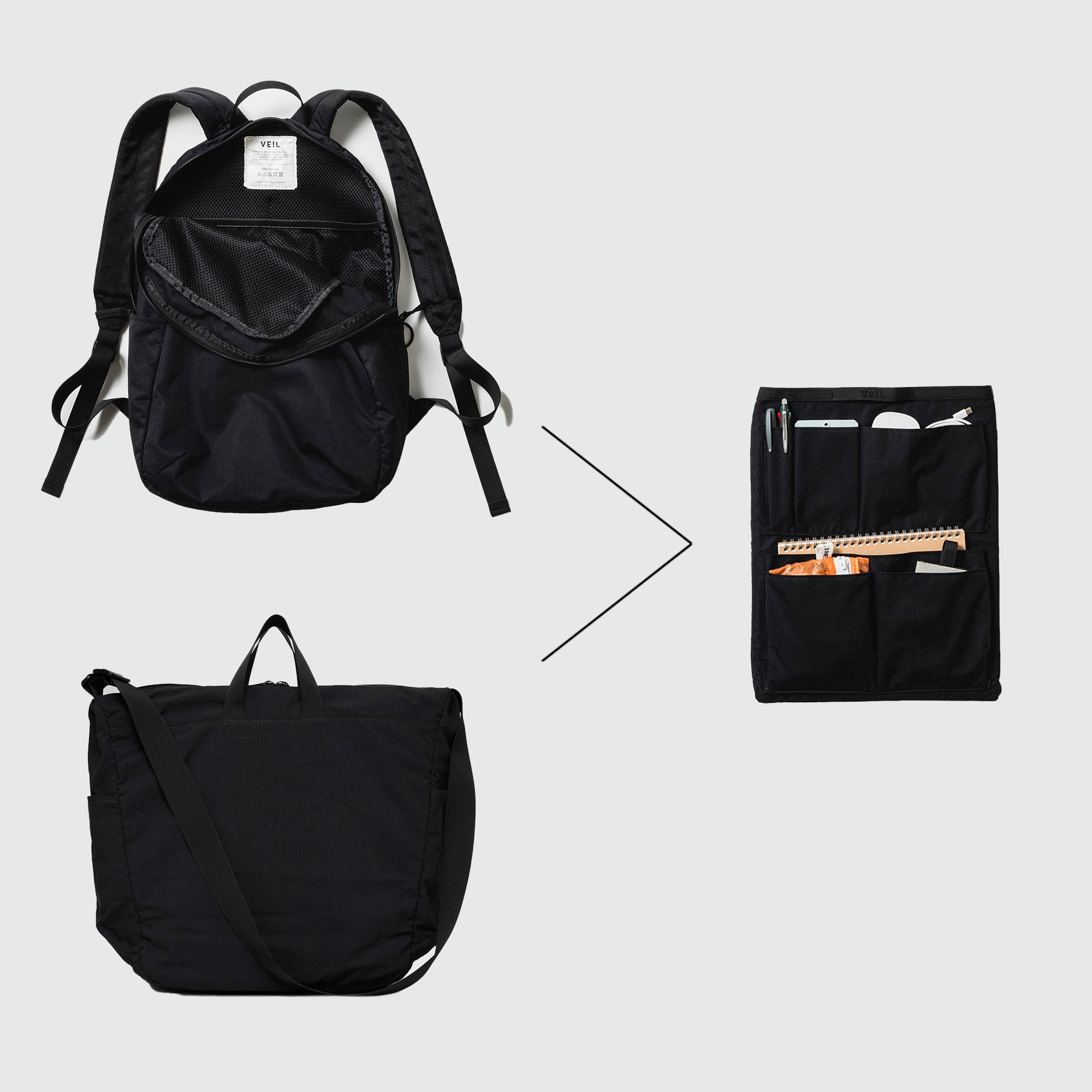 しかしバッグは持つ人のライフスタイルやファッションと密接に関係します。私たちはその日の気分や、外的環境によってバッグを変更します。VEILはその行動に対応すべく、雨季には防水仕様のアウターを、気分が変わればショルダータイプを選べるよう、軽やかにチェンジできるため様々なモデルを展開していきます。
